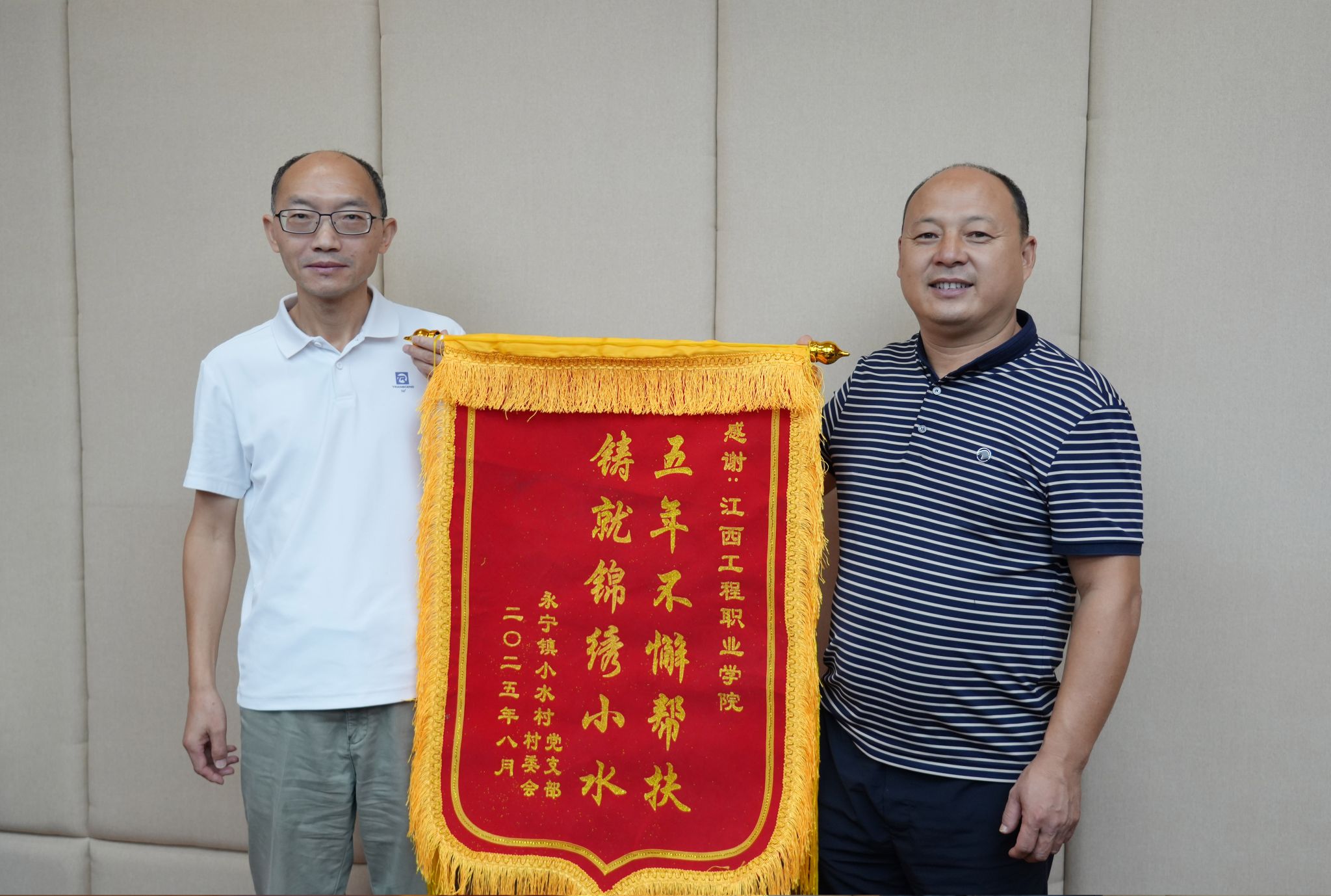 近日,宜春市铜鼓县永宁镇党委委员、副镇长李乔强,小水村党支部书记温小平一行4人来到学校,代表全体村民赠送锦旗,感谢学校五年来对小水村的倾力帮扶。学校党委委员、副校长黎武之出席赠送仪式,学校驻村工作队队员彭帆、颜斌参加仪式。